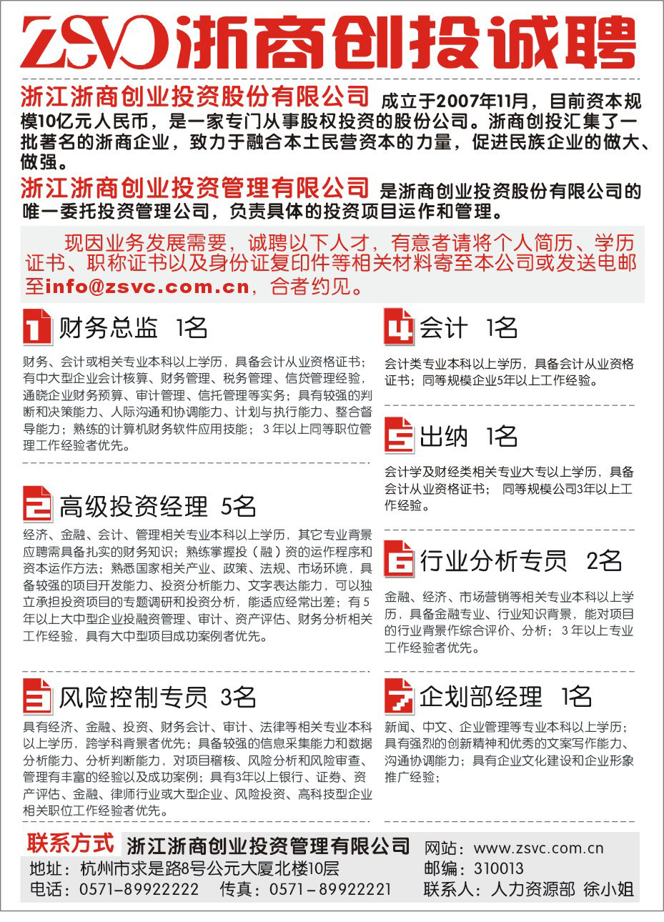 浙商創投誠聘各類人才