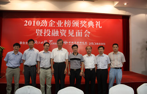 8月14日,由錢江晚報、浙商研究會、中科商學研究院、浙商創投聯合主辦的“2010勁企業榜頒獎禮暨投融資見面會”在金溪山莊舉行,20多家勁企業赴現場領獎,浙商研究會會長胡祖光、浙商創投管理公司董事長陳越孟、錢江晚報副總編蕭敏健、中科商學研究院執行院長潘強龍為獲獎企業頒獎。