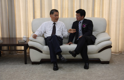浙江大學黨委書記金德水(左一)與浙商創投管理公司董事長陳越孟(右一)在休息室交談