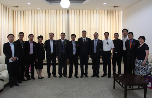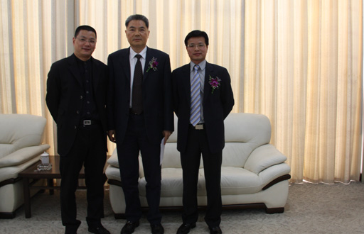 浙江大學黨委書記金德水(中)與浙商創投管理公司陳越孟董事長(右)、行政總裁華曄宇(左)合影